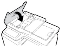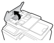 - Lift the document feeder roller assembly, and then gently pull the jammed paper out.Figure : Lift the rollers and remove jammed paper