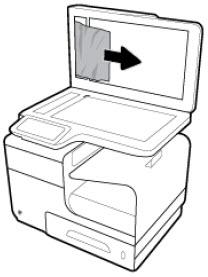 - Open the scanner lid. If paper is jammed behind the white plastic backing, gently pull it out.Figure : Remove jammed paper under scanner lid