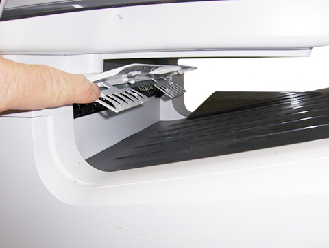 - If the paper is still not visible or accessible, remove the Ink Collection Unit (ICU)/duplexer by pulling it out with one hand and keeping it level to prevent unwanted ink spills. Set the duplexer aside, upright, on a piece of paper to prevent ink spills.